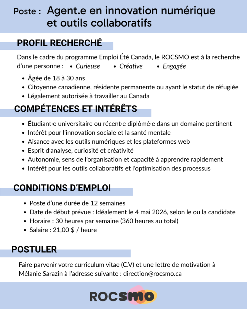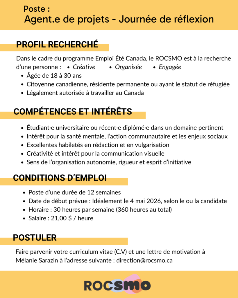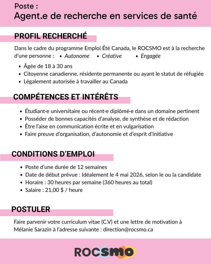 Dans le cadre du programme d’Emploi Été Canada 2026, le ROCSMO cherche à combler trois postes. Si l’uns d’entre eux t’intéresse, fais parvenir ton C.V à l’adresse suivante : direction@rocsmo.ca