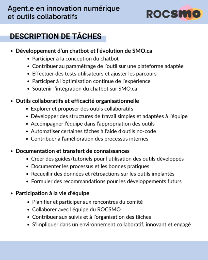 Ce poste vise à développer un chatbot pour le site web SMO.ca, ainsi que d’explorer différents outils collaboratifs permettant de faciliter le travail de l’équipe.